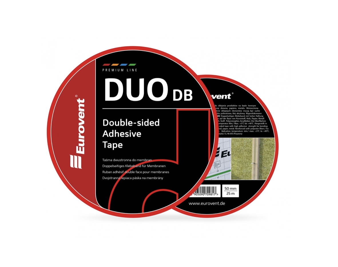 Eurovent DUO Double-Sided Adhesive Tape is a professional-grade sealing solution designed for joining vapor barriers, membranes, and foils with maximum precision and strength. Its double-sided adhesive coating ensures secure bonding of overlaps, eliminating the risk of air leakage and moisture penetration. Highly resistant to aging, temperature fluctuations, and humidity, Eurovent DUO guarantees long-lasting airtightness and energy efficiency. This versatile construction tape is an essential accessory for sustainable, airtight building envelopes.