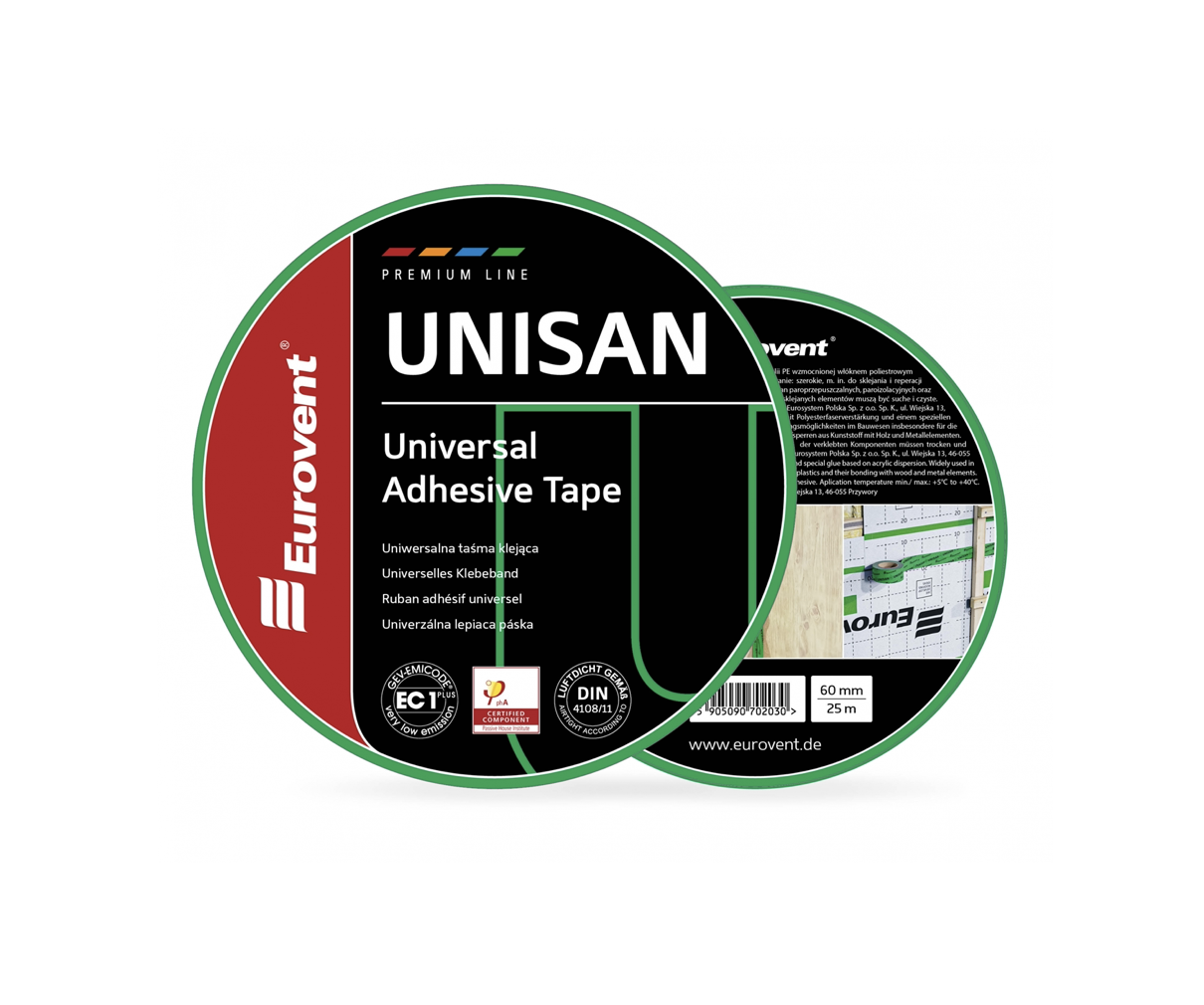 Eurovent UNISAN Universal Adhesive Tape is a high-quality, single-sided tape designed for professional sealing of various construction materials. Ideal for joining and repairing membranes, foils, and vapor barriers, it guarantees long-lasting airtight and watertight bonds. Resistant to aging, UV rays, and extreme temperatures, UNISAN provides strong adhesion on a wide range of substrates including wood, metal, and plastic. Perfect for both indoor and outdoor applications, this universal adhesive tape is an essential accessory for ensuring energy efficiency, airtightness, and moisture protection in modern construction projects.
