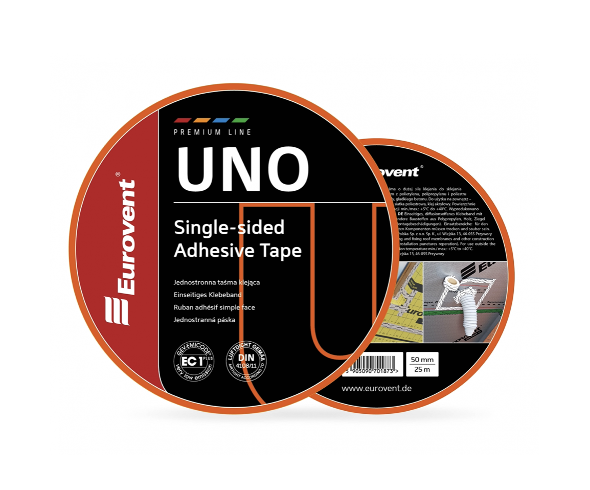 Eurovent UNO single-sided adhesive tape provides strong and durable sealing for vapor barriers, membranes, and foils, ensuring airtight and watertight connections in construction. Size: 50mm x 25rm