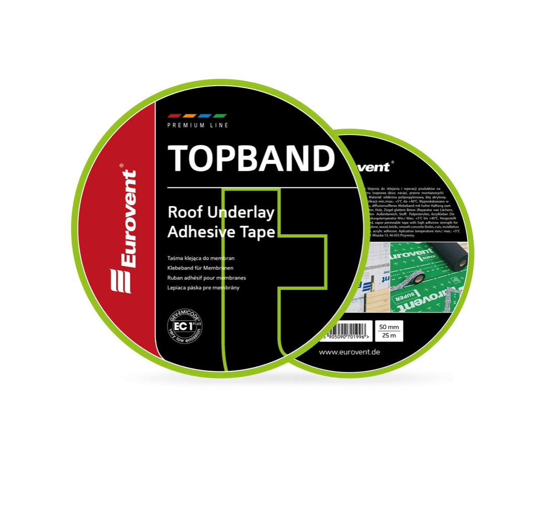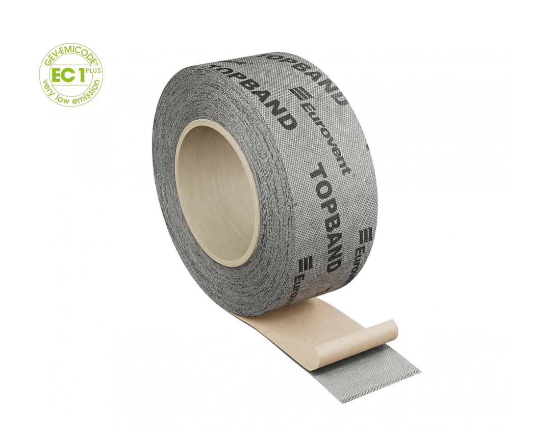 Eurovent TOPBAND is a high-performance single-sided adhesive tape, ideal for sealing overlaps, repairing tears, and ensuring airtight connections in construction membranes, façades, and roof underlays. Engineered with a durable carrier and a strong acrylic adhesive, it offers excellent resistance to ageing, moisture, and UV rays, guaranteeing reliable long-term performance. Suitable for professional applications on building sites, Eurovent TOPBAND ensures effective protection against air leaks and water ingress, helping to maintain energy efficiency and structural durability.